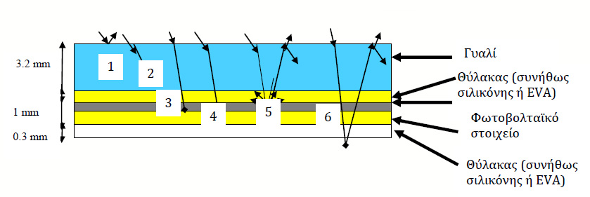 Κάτι που γνωρίζουν ίσως λίγοι είναι, ότι το γυαλί που προστατεύει τα ημιαγώγιμα στοιχεία του φωτοβολταϊκού έχει υποστεί θερμική επεξεργασία σκλήρυνσης και ανάλογα με τον κατασκευαστή, το πάχος του διαφέρει και κυμαίνεται μεταξύ 3 και 6 mm. Διαφορετικές είναι επίσης και οι απώλειες που οφείλονται στην ανάκλαση. Παγκόσμιες έρευνες έχουν αποδείξει ότι, δίνοντας μια συγκεκριμένη τραχύτητα στο γυαλί, οι απώλειες ανάκλασης μειώνονται, αλλά η αύξηση της μέσης διαδρομής που διανύει η ακτίνα αυξάνεται, οπότε αντίστοιχα αυξάνονται και οι απώλειες απορρόφησης. Επομένως, υπάρχει ένα κρίσιμο ανάγλυφο του γυαλιού, η διατήρηση του οποίου εξασφαλίζει μια μέση ετήσια αύξηση της απόδοσης του φωτοβολταϊκού έως και 7%. Η υφή του αναγλύφου αυτού, το οποίο συνήθως έχει τη μορφή ανεστραμμένων πυραμίδων, κυμάτων ή πυραμιδοειδών αυλάκων, σιγά-σιγά καταστρέφεται λόγω περιβαλλοντικών συνθηκών, αποξεστικών μέσων και απορρυπαντικών κατά το καθάρισμα, κλπ.